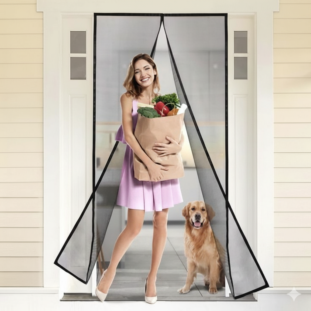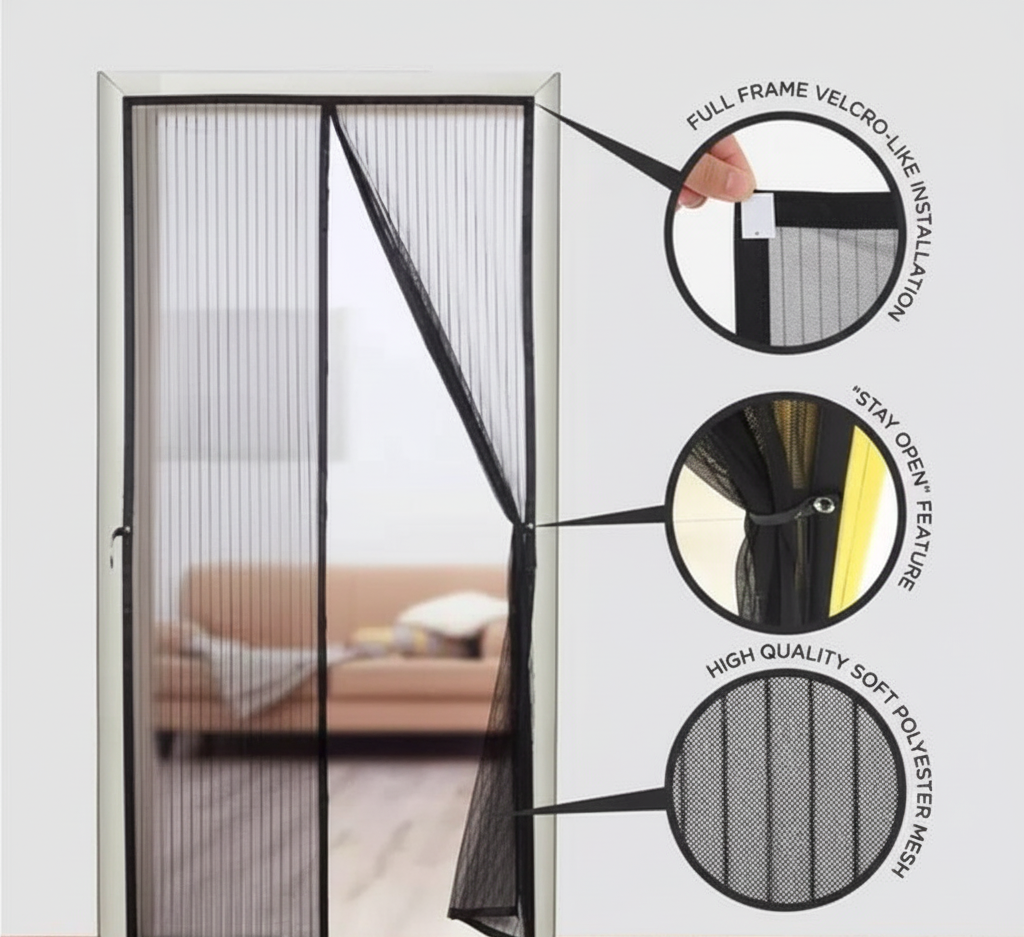 It seals your doorway automatically using strong magnets  no gaps, no stress, no chemicals.